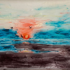 "Sundance In the summer of 2021, my mother faced very serious health problems that led her into a coma. Sitting by her side and holding her hand in the ICU, I would play music for her for hours of her favorite songs and I would sing at the top of my lungs, praying that eventually the power of music and love would wake her and bring her back to us. Multiple miracles occurred, and she awoke, at first squeezing my hand, and eventually spelling out “I LOVE U” in the air with her free hand, as she was unable to speak because of the tubes. As her health improved, we were able to bring her on a family vacation to North Wildwood, NJ. From her room, she was able to view the ocean and the sunrise every morning. One of the songs I played for her daily during her ICU stay was Lee Ann Womack’s “I Hope You Dance.” This painting is a recreation of one of the morning sunrises of that miraculous summer. Giving new purpose to found unused construction materials, plexiglass was chosen for its translucency, providing an ethereal quality. This painting captures the serenity and glorious power of the new day as nature gifts upon those who awaken, a choice to dance."